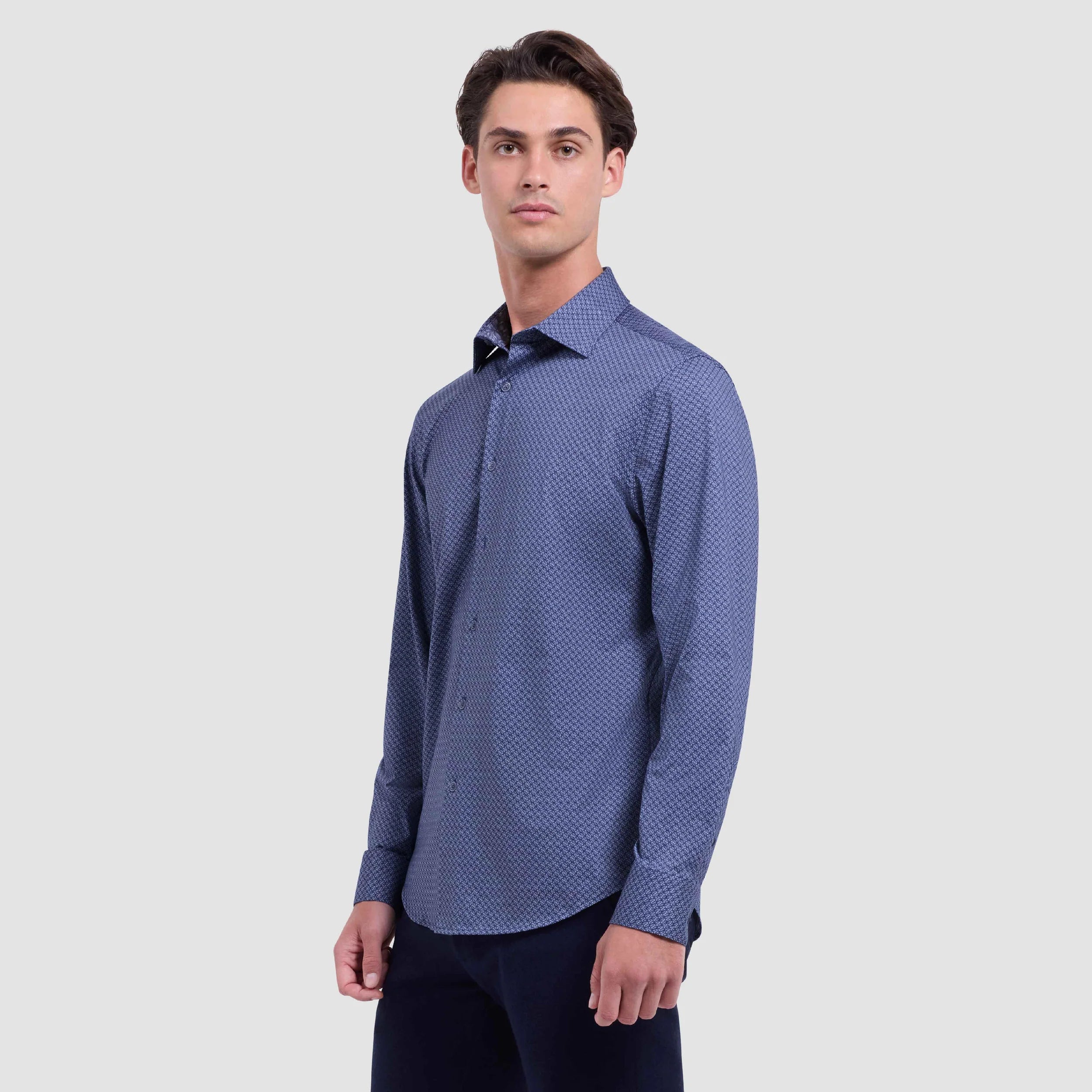 The Jimmy double-sided OoohCotton® shirt with geometric and leaf prints features a point collar and a curved hem for a sleek tucked or untucked look. The notched cuffs are adjustable to allow for customized fit and also convertible to accommodate cufflinks. OoohCotton® is a performance, double-mercerized, wrinkle-resistant, breathable, and easy-care cotton blend with 8-way stretch, quick-dry, and thermal comfort properties.